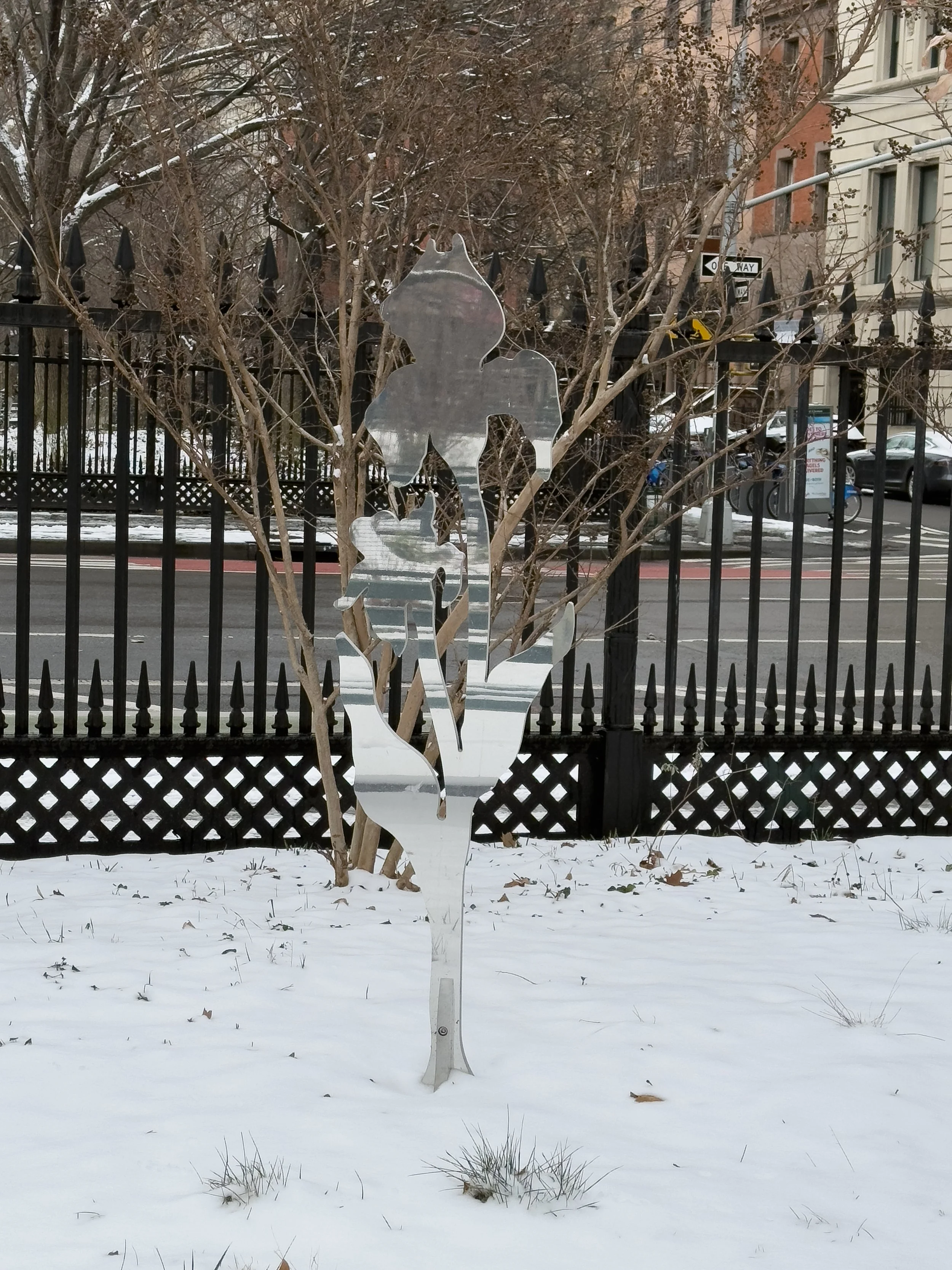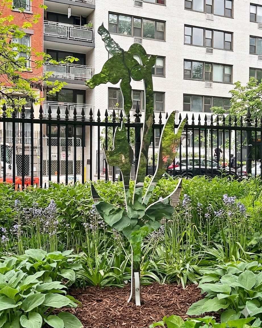 Blooming Reflection – Yellow Lily, Polished stainless steel, 18 ¼” X 1 X 72” 2024, Edition of 3 +AP