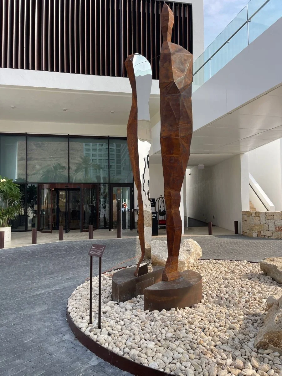 Humane Geometry, Polished stainless steel, Hot rolled steel, Corten steel, 58 X 58 X 197” 2025, Created in collaboration with Eyal Assulin