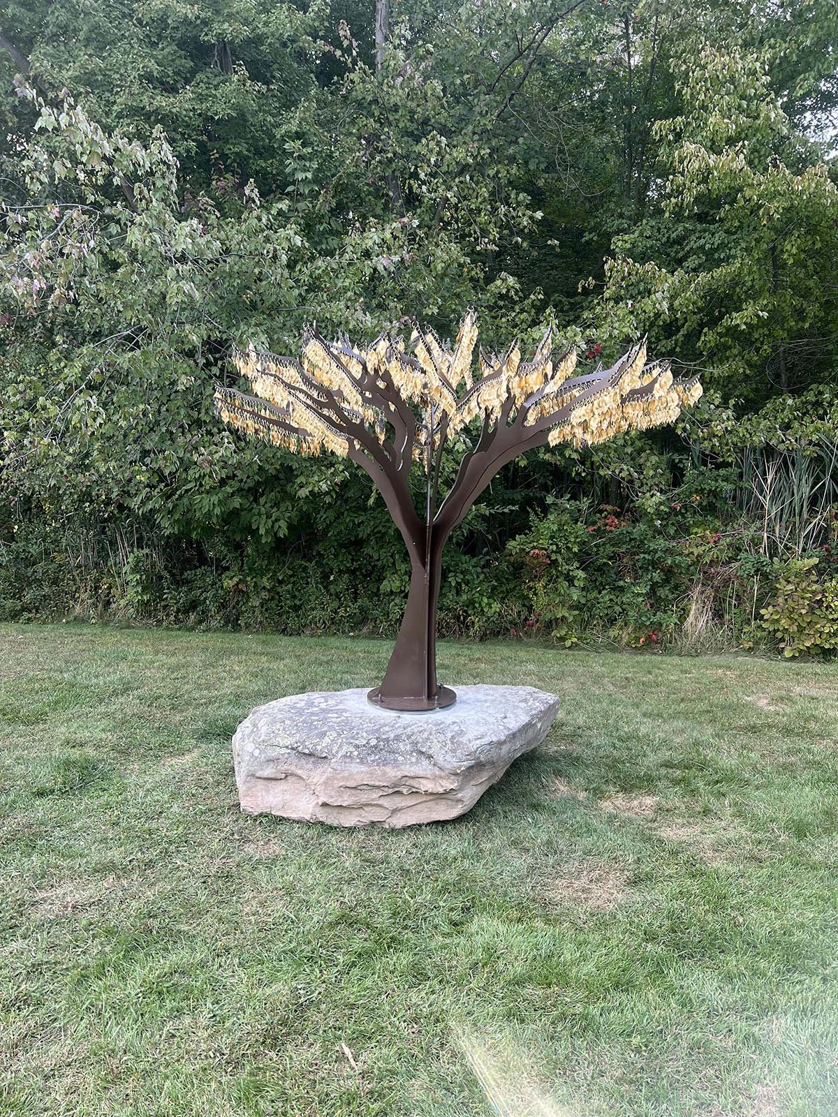 Chimes Tree, Painted Steel, Brass & Bolder, 132 X 128 X 94” 2024 produced by Insight-public art solutions