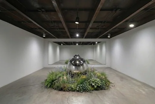 Lithium, Polished stainless steel, wood, soil, mirror, moss, plants, rocks, 133 x 128 x 56”, CGR, 2026